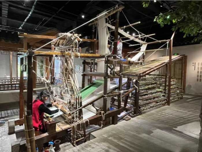 穿过中庭,步入织染坊,两台巨大的织机立于大厅中央,几位工匠正忙碌地操作着。上前询问后才了解,原来眼前就是代表中国最高织造技艺的宋锦小花楼织机和五彩漳缎大花楼织机,这两台机器也是丝绸博物馆最大的亮点。